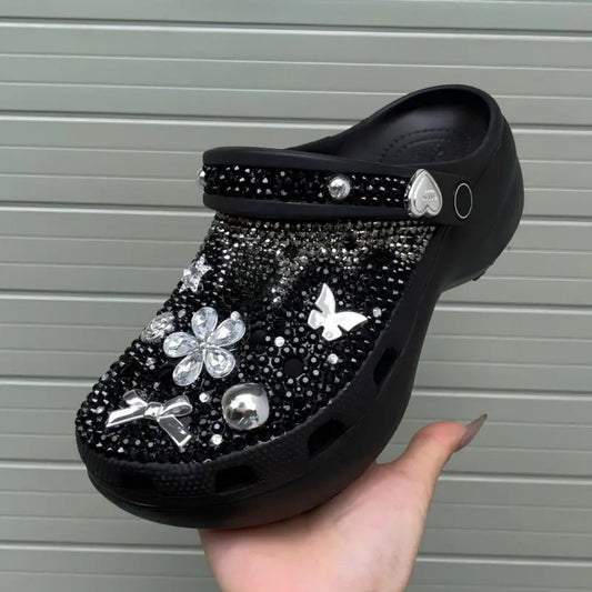 ShineWalks™ Cross Bloom Noir Crystal Clogs – Midnight Black